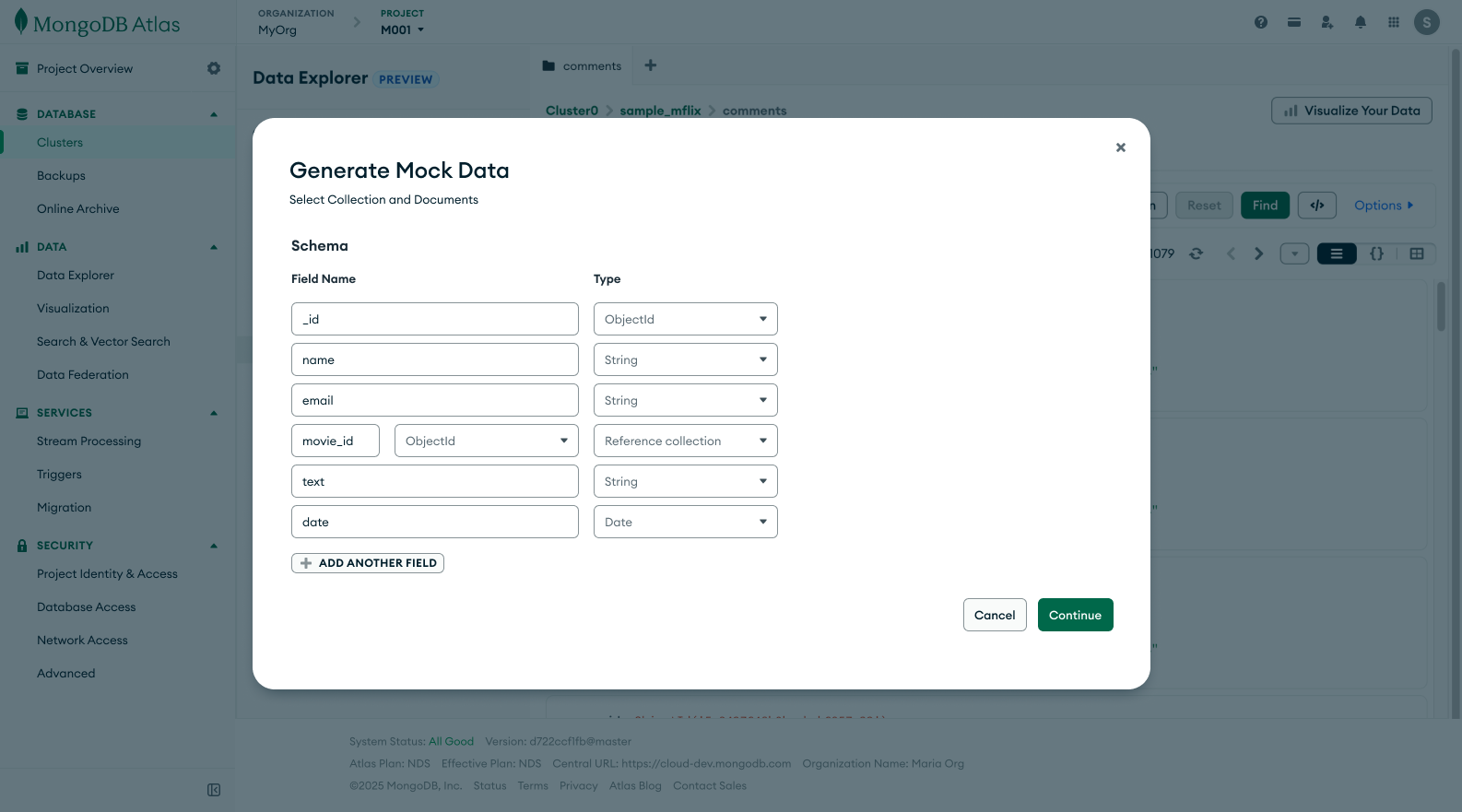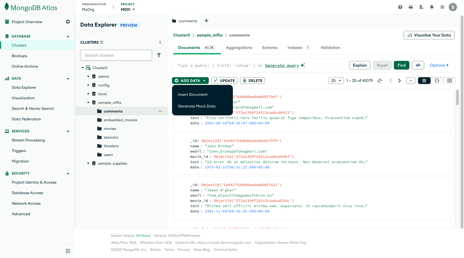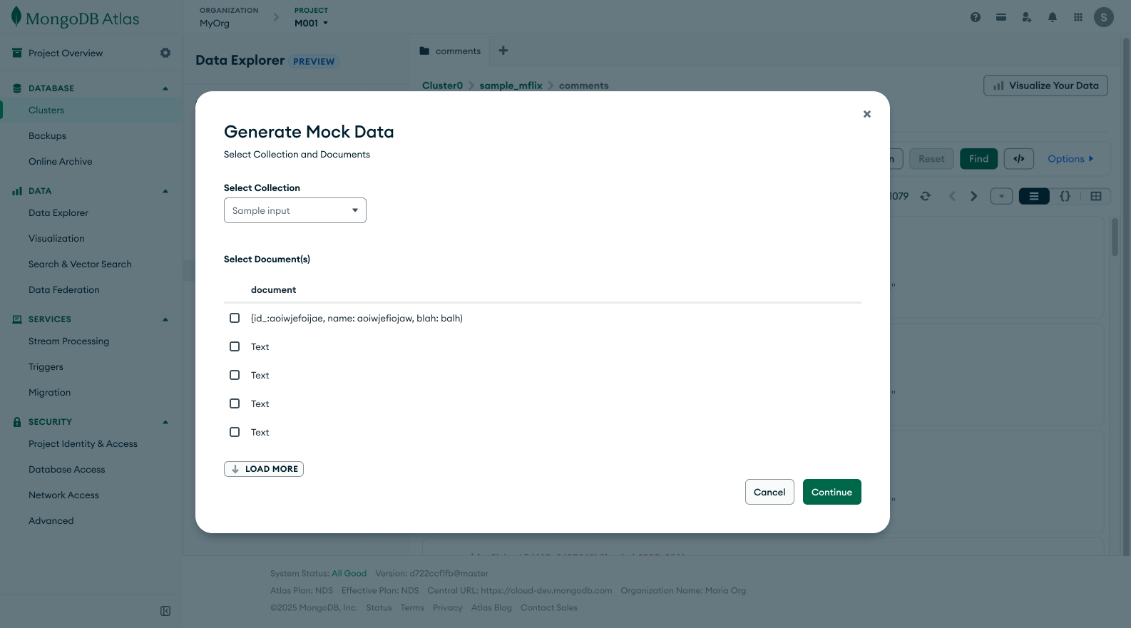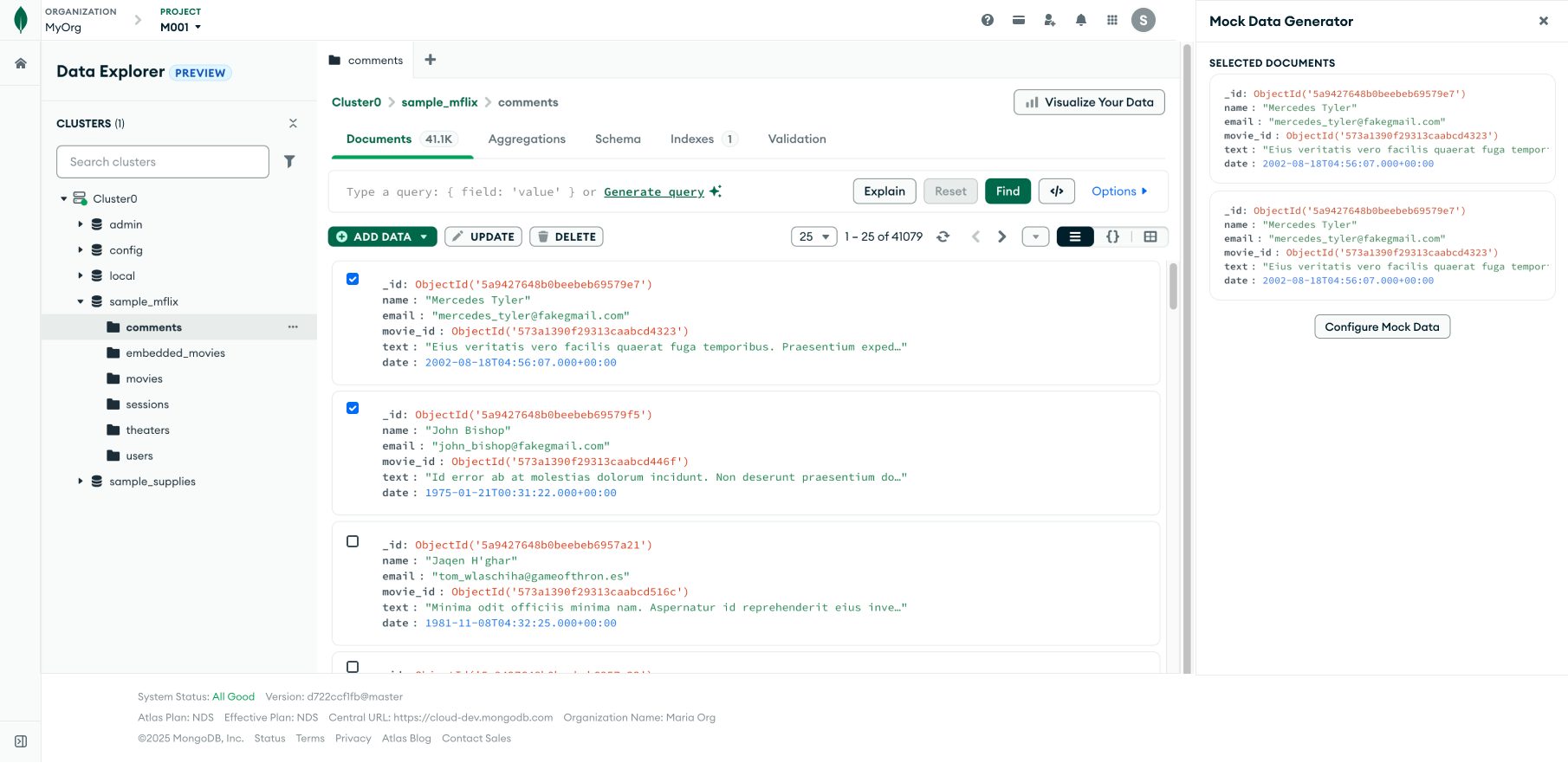 Creating mock data is a key requirement for development and testing. Typically, once developers establish their data model, they generate some mock data. However, currently users are unable to generate data through the Atlas UI which forces them to find another way to (programmatically, leveraging AI) and/or results in them getting stuck